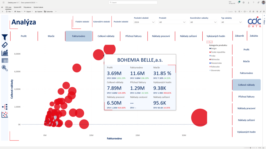 Dashboardy jsou interaktivní, takže si každý uživatel může snadno filtrovat data podle svých potřeb a okamžitě najít odpovědi na konkrétní otázky. Manažeři mají přehled o výkonnosti firmy, obchodníci o prodejích, finanční tým o nákladech a výnosech. Všichni pracují se stejnými, aktuálními daty, ale každý vidí pouze ta data, která se týkají jeho role nebo oddělení.